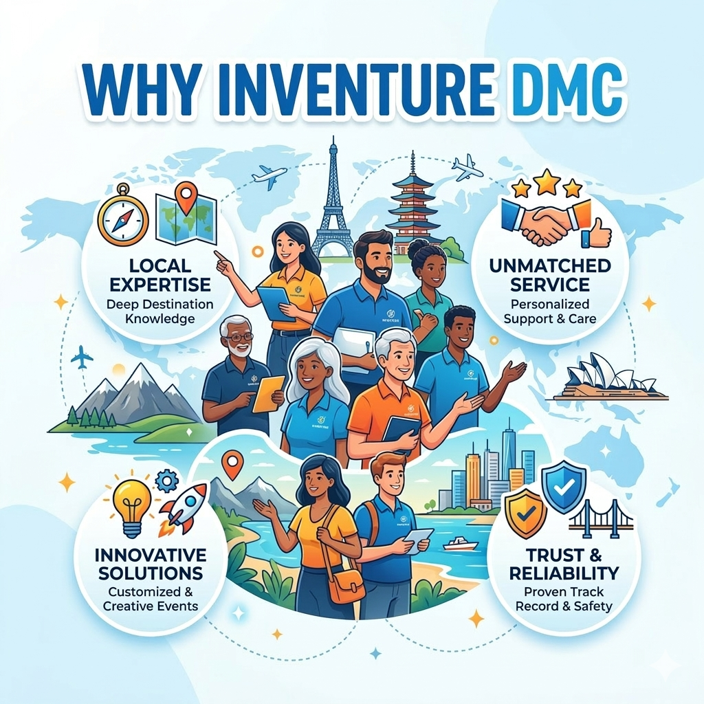 The strength of Inventure DMC Private Limited lies in our deep destination expertise and strong local partnerships. Our experience allows us to handle everything from individual travelers to large group tours efficiently.